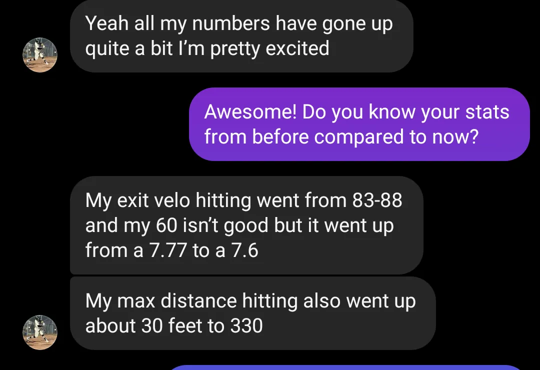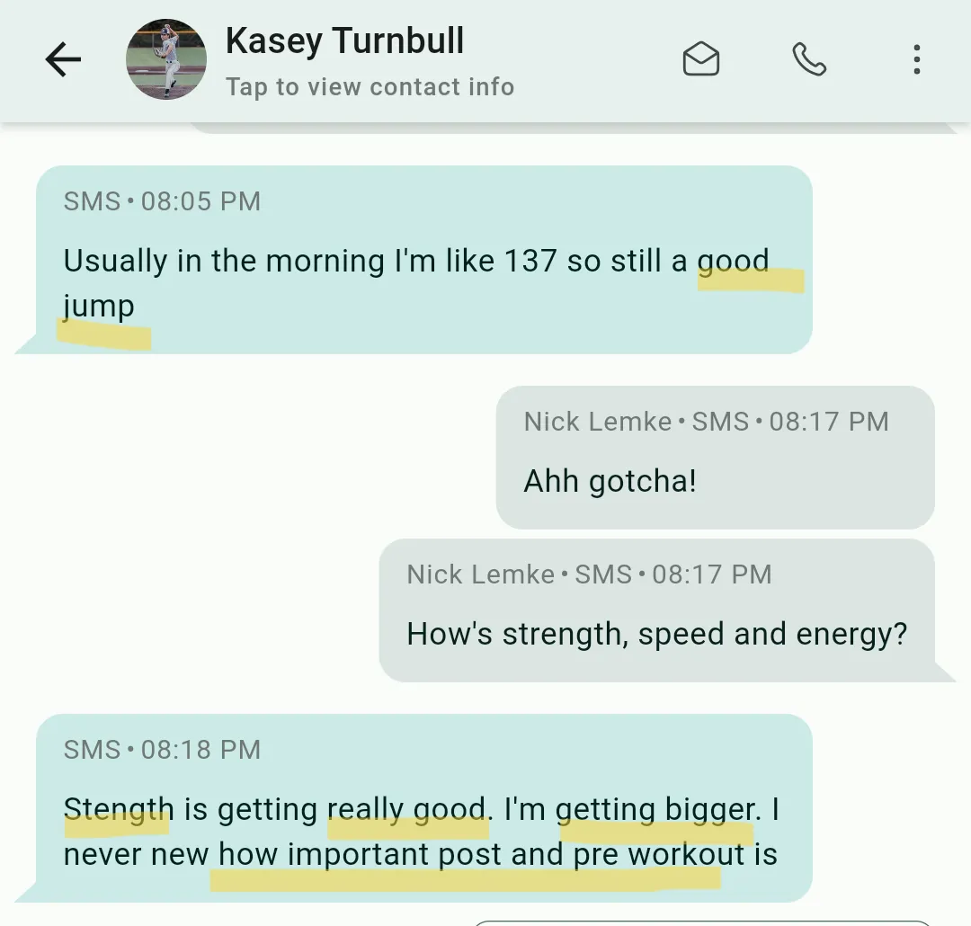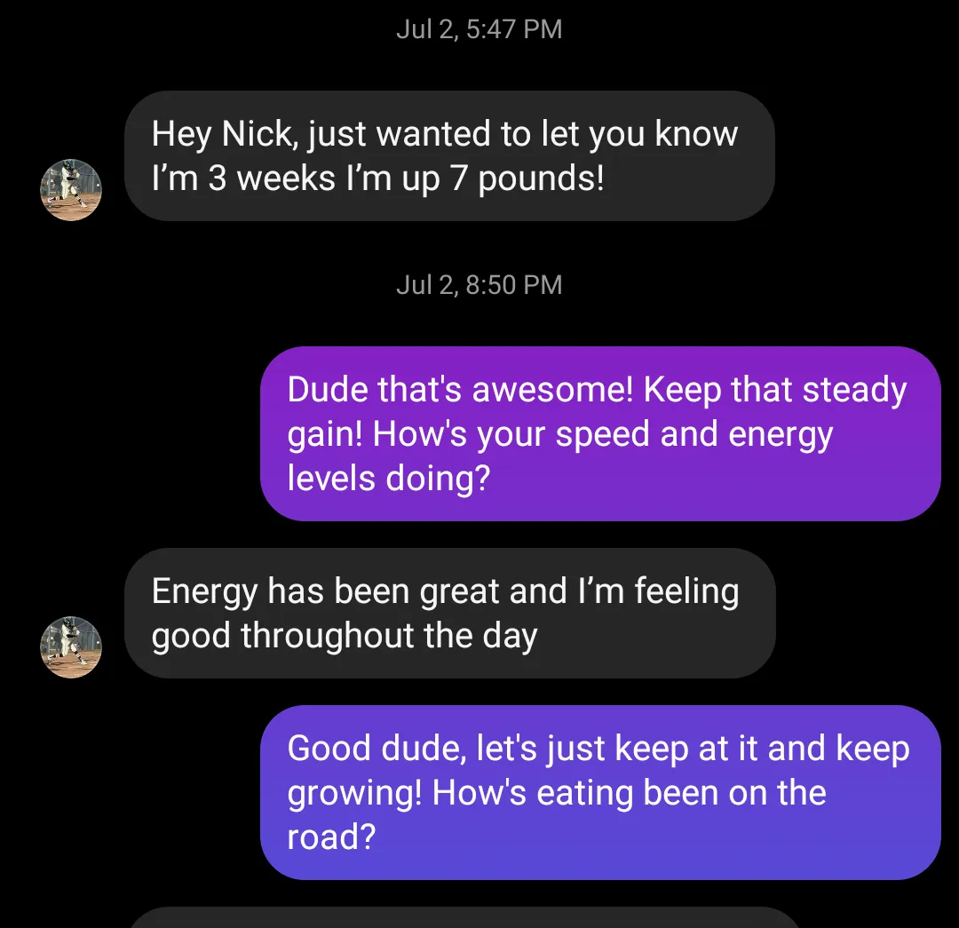 "Hey Nick, thank you for everything you've done to help me reach my goals! From my family and I were very grateful. I finally got my weight up to where I want I'm sitting right now around 167 I feel so much stronger and better now”